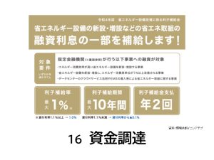 省エネ設備を導入するために金融機関から融資を受けた際、その利息の一部を国が負担する制度です。