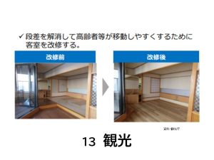 宿泊施設: 客室の段差解消、車椅子対応トイレ・ユニットバスの導入、昇降機の設置